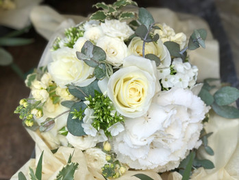 After several discussions, emails with images, we were able to envisage Charlotte's dream wedding flowers. A mixture of ivory/white with touches of peach (for memory of grandma) and lush eucalyptus greenery for her bridal bouquet and ivory for the five bridesmaids to complement their gowns. The wedding ceremony was held in the walled garden with the traditional wooden pergola and seating for guests. The ceremony pergola was decorated with ivory calico drapes and coordinating floral arrangements with a large, long and low design for the Register Table with coordinating designs for the aisle chairs. Contents include white Snowball hydrangeas, peach stocks, pale peach spray roses, an abundance of mixed tonal eucalyptus, white larkspur, scented Norma Jean ivory roses, matricaria and vibernum snowball.